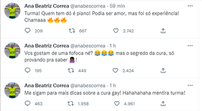 A própria Bia se surpreendeu: “Sou a cura gay”, publicou em uma série de tuítes. “Turma! Quem tem dó é piano! Podia ser amor, mas foi só experiência!”