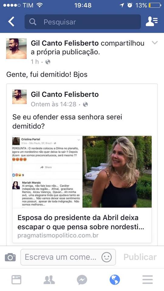 Aceito qualquer que tenha sido o motivo real da minha demissão, honestamente. O que não posso aceitar é que uma pessoa, esposa de um presidente de uma empresa como a editora Abril, use sua rede social para denegrir e/ou ofender um povo que sempre lutou pelo país.