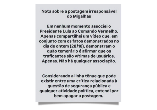 Após a repercussão, o magistrado apagou suas publicações e explicou o motivo. “Considerando a linha tênue que pode existir entre uma crítica relacionada à questão de segurança pública e qualquer atividade política, entendi por bem apagar a postagem”, afirmou em nota.
