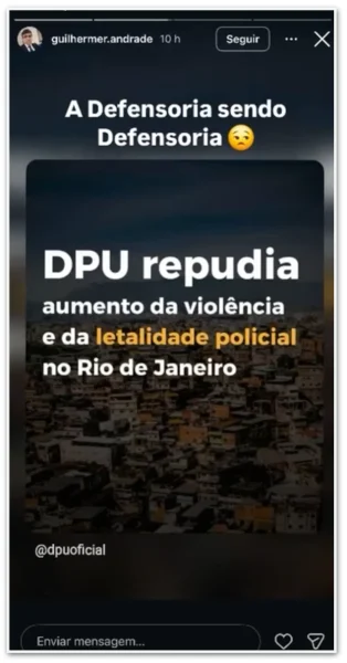 A publicação foi deletada, mas já havia circulado entre seus seguidores. Além da crítica à DPU, Andrade republicou um vídeo que colocava o presidente Lula lado a lado com traficantes do Comando Vermelho.