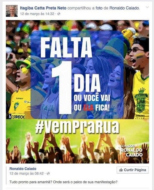 Esteve em vários protestos pelo impeachment e recheou seu Facebook de fotos com a galera verde-amarela.