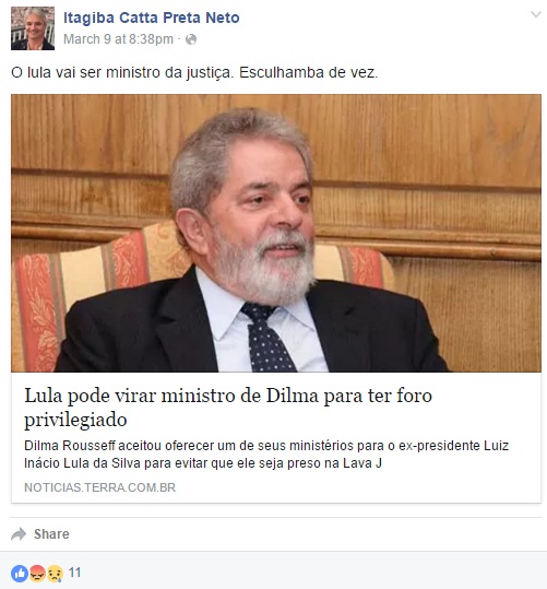 Esteve em vários protestos pelo impeachment e recheou seu Facebook de fotos com a galera verde-amarela.
