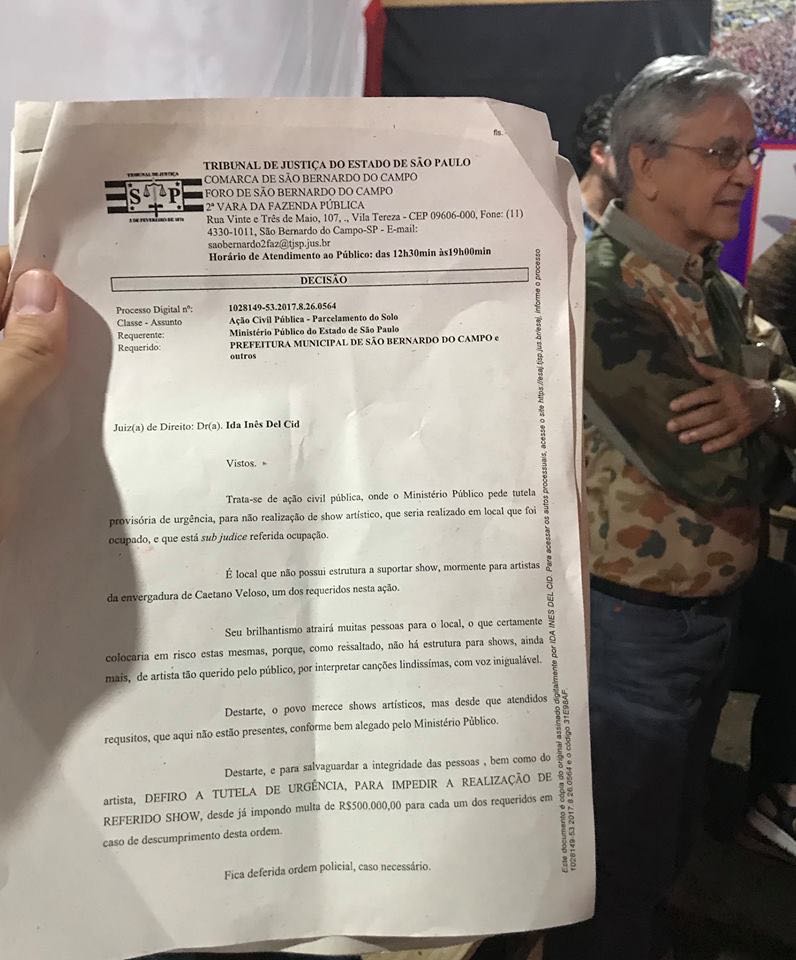 A juíza Ida Inês Del Cid, da 2ª Vara da Fazenda Pública de São Bernardo do Campo, atendeu ao pedido do Ministério Público para impedir a realização de um show de Caetano Veloso na ocupação do MTST no Bairro Planalto.