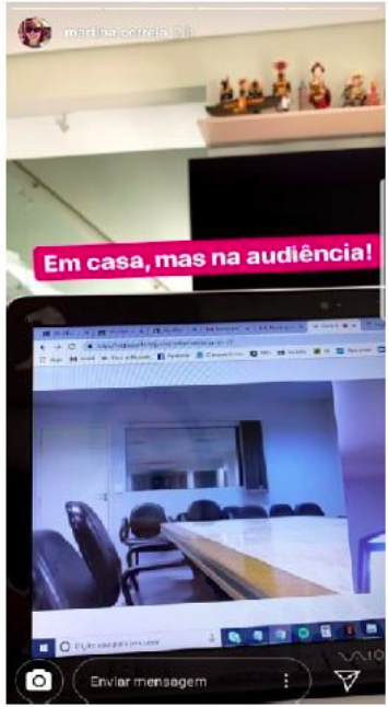 É que a primeira imagem, que mostra a defensora “em casa, mas na audiência”, é de um domingo (27 de janeiro deste ano), quando é permitido por lei a defensores, promotores e advogados realizar as audiências em esquema de plantão, por videoconferência, de casa ou de onde bem entenderem, conforme a própria defensora explica, na ação judicial que move contra os parlamentares do MBL:
