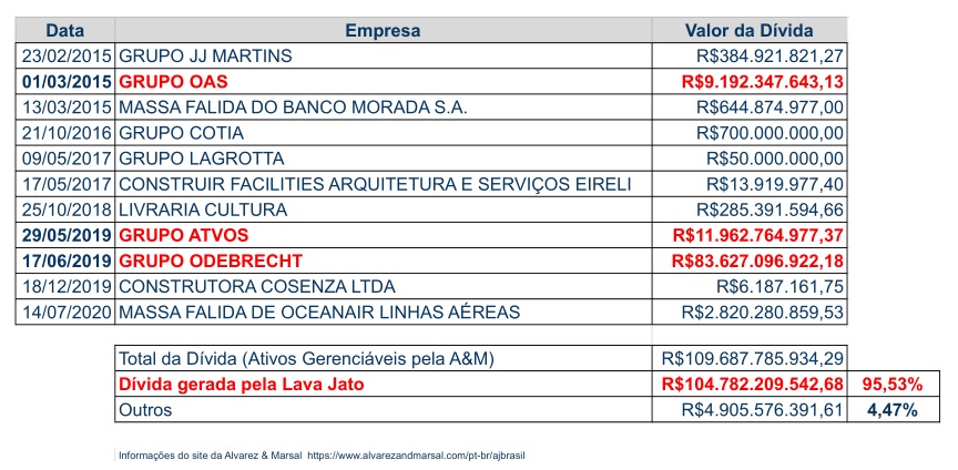 De toda a fonte de receita da A&M em AJ, 95,6% vieram – e ainda virão, pois processos de reestruturação de dívidas podem durar dezenas de anos para serem realizados – diretamente das mãos da força-tarefa da Lava Jato.