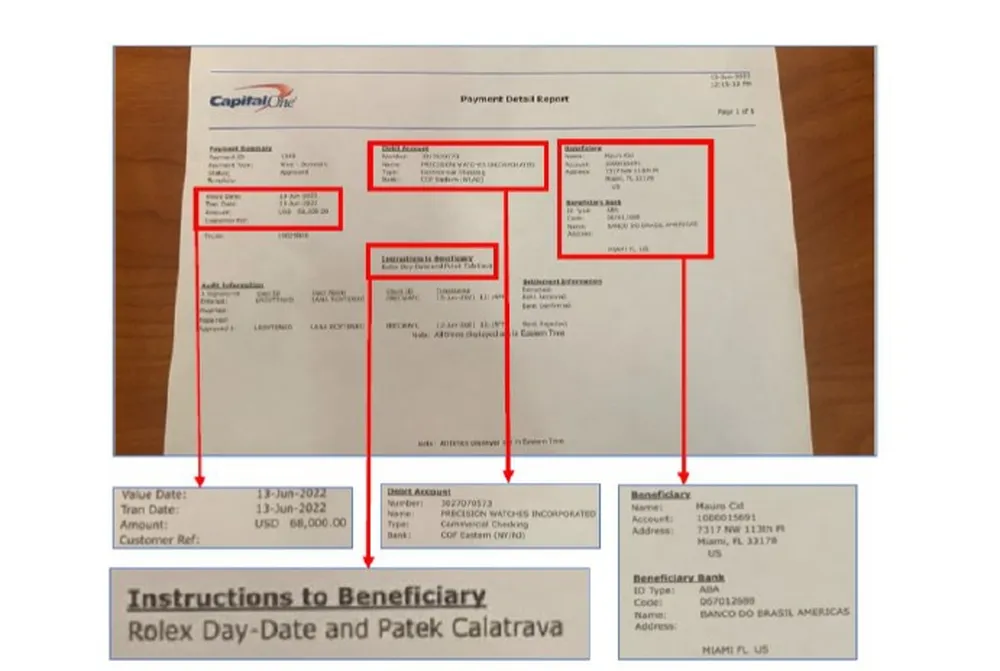 O documento mostra que os relógios foram vendidos por US$ 68 mil. O dinheiro da venda foi depositado em uma conta de Mauro Lourena.
