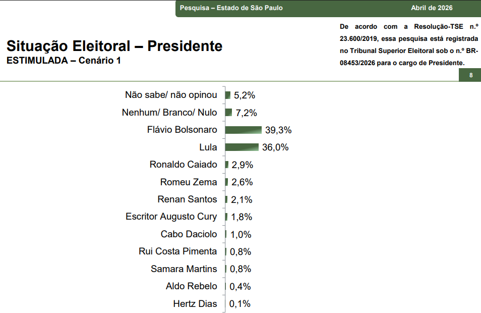 Os votos em branco, nulo ou nenhum candidato somam 7,2%, e outros 5,2% dos entrevistados disseram não saber ou preferiram não opinar. O quadro reforça que, embora Flávio lidere, ainda existe espaço para movimentação na corrida em São Paulo, principalmente porque Lula conseguiu encurtar a distância em relação ao adversário e aparece competitivo no estado.