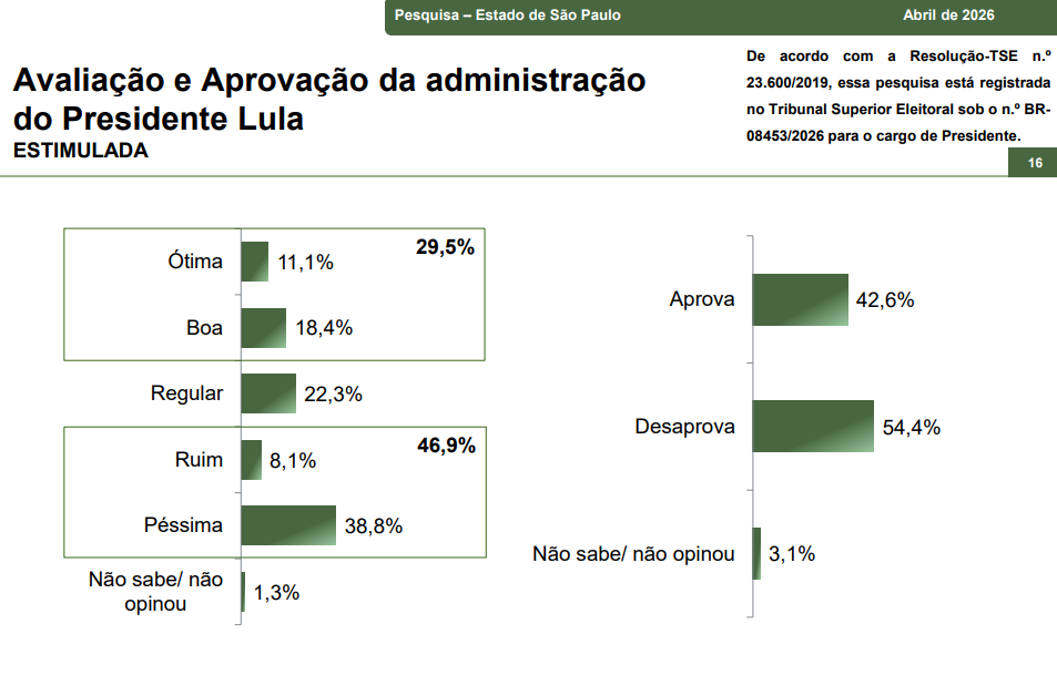 A pesquisa também mediu a avaliação do governo federal entre os paulistas. Segundo os dados, 42,6% aprovam a gestão de Lula, enquanto 54,4% desaprovam. Outros 3,1% não souberam opinar. Na avaliação qualitativa, 11,1% classificam o governo como ótimo e 18,4% como bom. Já 22,3% consideram a gestão regular, 8,1% a definem como ruim e 38,8% como péssima.