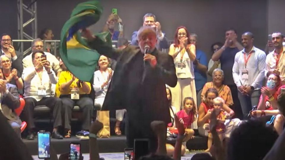 Veja imagem de Lula com a bandeira do Brasil durante o evento: