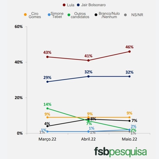 De acordo com pesquisa do instituto FSB, encomendada pelo BTG/Pactual, o ex-presidente Luiz Inácio Lula da Silva (PT) ampliou sua vantagem sobre o presidente Jair Bolsonaro (PL) nas intenções de voto para o Palácio do Planalto.