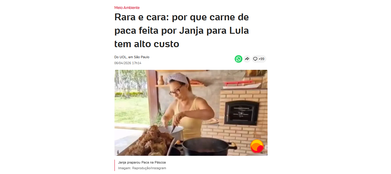 No UOL foram duas em menos de 24 horas. A primeira demonstrava sincera preocupação com a possibilidade de crime ambiental, pois o pobre animal teve a infelicidade de servir de alimento à família do presidente Lula no almoço de Páscoa. Esclarecido que a criação de pacas para consumo é perfeitamente permitida pela legislação vigente, o interesse jornalístico, longe de diminuir, mudou de ângulo em outra manchete bombástica: “Rara e cara: por que carne de paca preparada por Janja para Lula tem alto custo”.