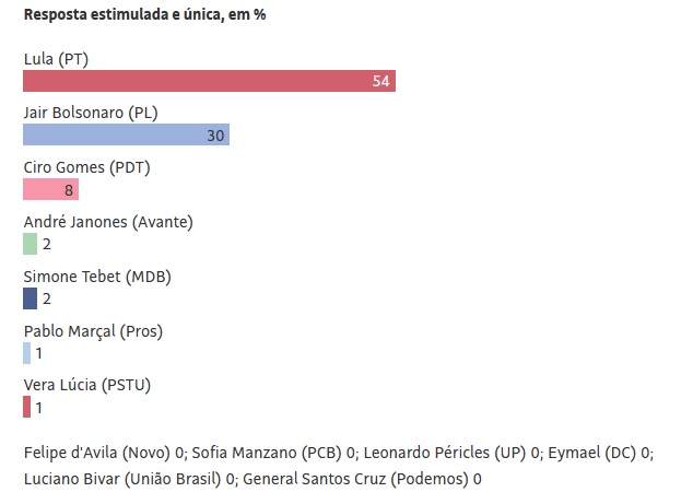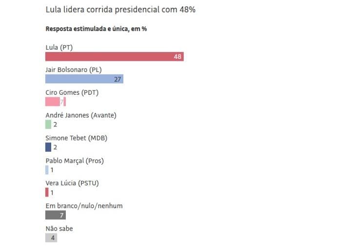 De acordo com os dados do levantamento feito pelo instituto, o petista possui 48%, enquanto o atual chefe do executivo federal tem 27% das intenções de votos. O pedetista foi citado por 7%. Os outros não chegaram aos 2%.