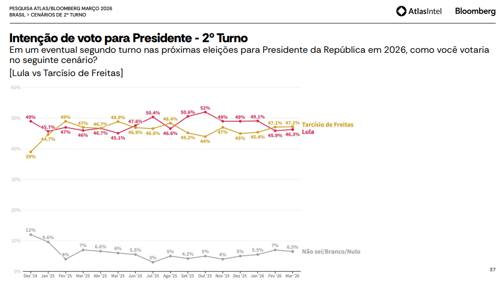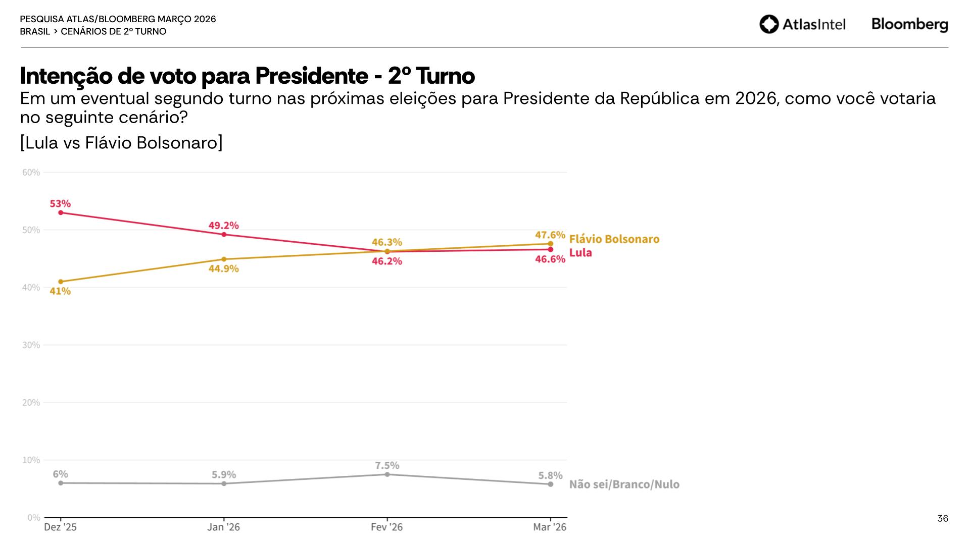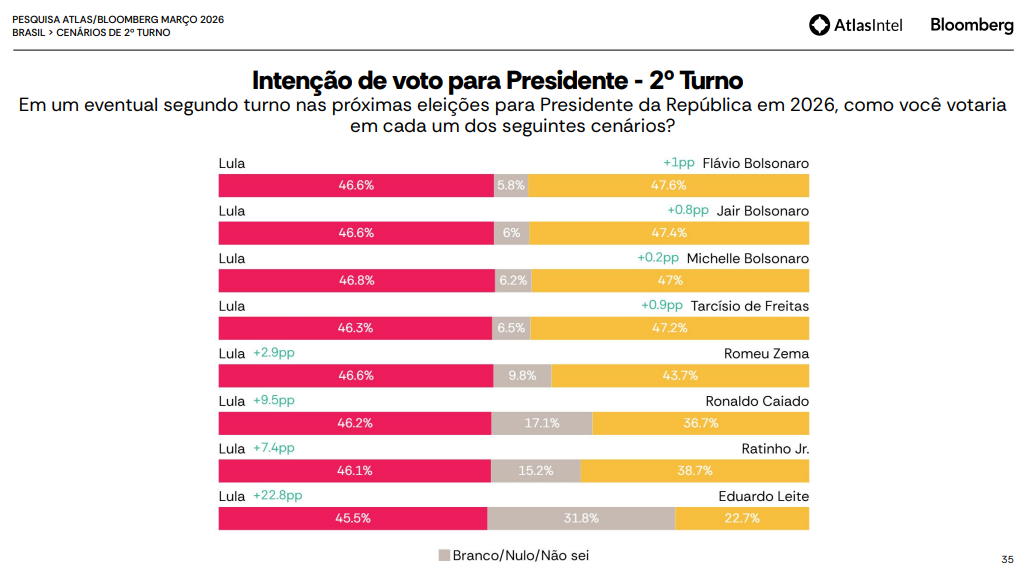 No primeiro cenário de 2° turno, Flávio Bolsonaro registra 47,6% das intenções de voto, contra 46,6% do Presidente Lula. O levantamento anterior, realizado em fevereiro, apontava 46,3% para o senador e 46,2% para o petista. Já os votos brancos, nulos ou indecisos somam 5,8%, em queda em relação aos 7,5% anteriores.