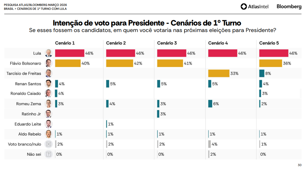 O levantamento também mostra que Lula lidera todos os cenários testados para o primeiro turno das eleições de 2026. No principal cenário, Lula aparece com 45,9% das intenções de voto, à frente do senador Flávio Bolsonaro, que registra 40,1%. Na sequência, surgem Renan Santos (4,4%), Ronaldo Caiado (3,7%), Romeu Zema (3,1%) e Aldo Rebelo (0,6%). Brancos e nulos somam 1,9%, enquanto 0,3% disseram não saber.