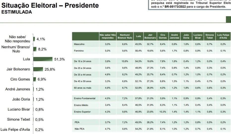 O petista registra 51,3% das intenções de voto na Bahia, enquanto Bolsonaro soma 25,8%. Em seguida, aparece Ciro Gomes (PDT), com 6,9%. Os demais candidatos têm um desempenho pífio no estado. André Janones (Avante) e João Doria (PSDB) são os dois que se saem melhor, com 1,2% cada.