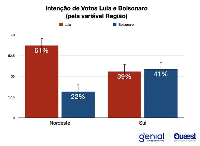 Por fim, quando o tema é região, o Sul aparece bastante dividido, com uma ligeira superioridade de Bolsonaro, enquanto no Nordeste, Lula vence de lavada.