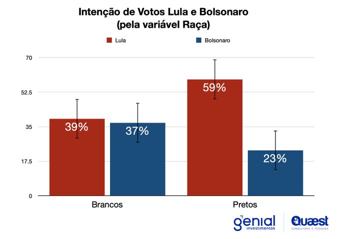 Na divisão por raça, porém, o petista vence nos dois lados. 59% dos eleitores que se identificam como negros votarão nele, contra 23% para o ex-capitão.