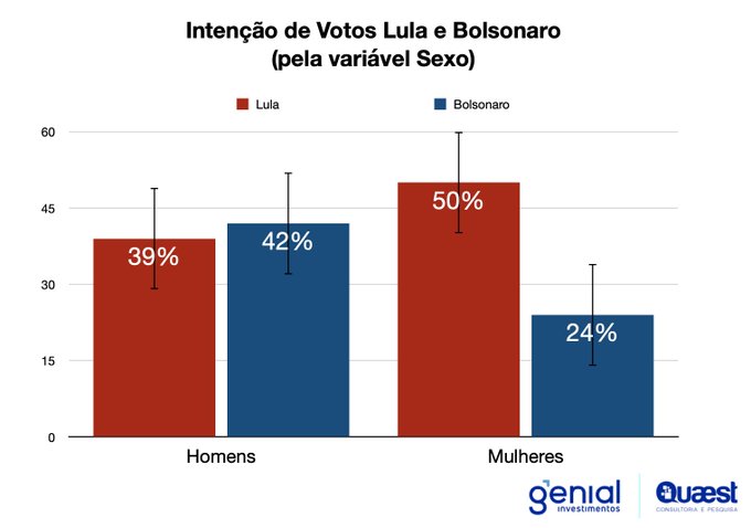 No recorte de gênero, o ex-presidente Luiz Inácio Lula da Silva (PT) é muito mais popular entre as mulheres do que seu principal adversário, o atual mandatário da República, Jair Bolsonaro (PL). O petista tem 50% das intenções de voto entre o eleitorado feminino, contra apenas 24% do ex-capitão do Exército, que é ligeiramente mais aceito entre os homens: 42% declaram voto em Bolsonaro, contra 39% para Lula.