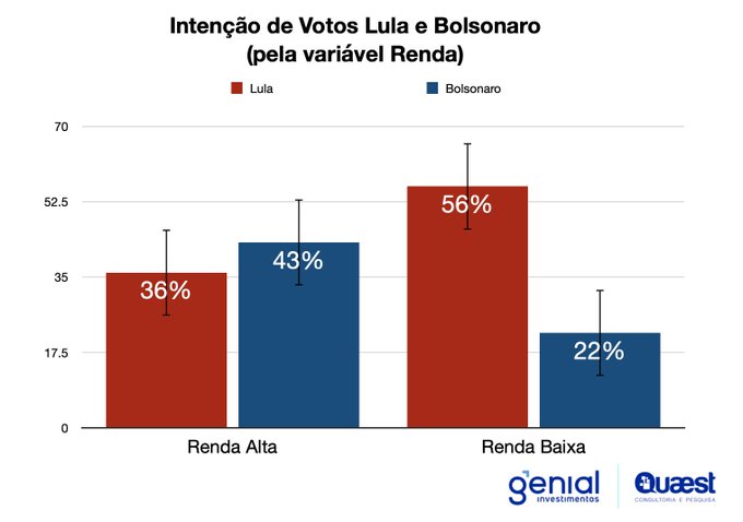 Por outro lado, o chefe do Executivo vence entre os ricos. 43% desse grupo é favorável a ele, com 36% apoiando Lula.