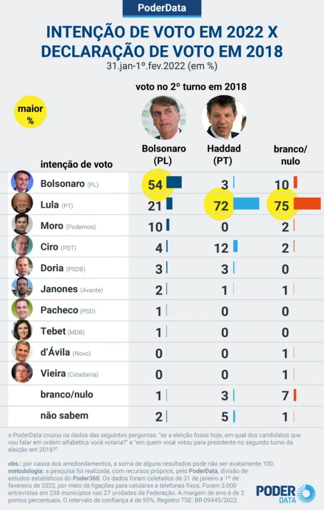 Vale lembrar que a pesquisa foi realizada entre os dias 31 de janeiro e 1º de fevereiro. Em números percentuais, o PoderData mostra que 21% (1 em cada 5) dos eleitores que optaram por Bolsonaro na disputa contra Fernando Haddad (PT) desejam votar em Lula na disputa pelo Planalto.