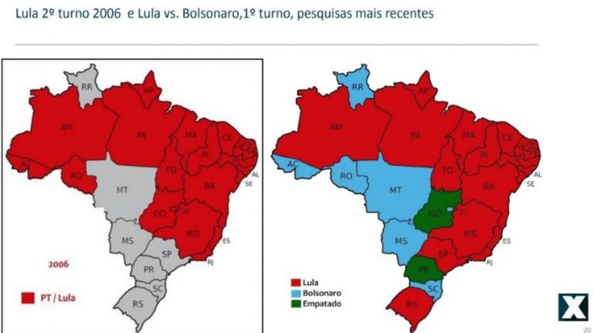 Na ocasião, Lula venceu em 19 estados e no Distrito Federal. Nas pesquisas deste ano, ele aparece em primeiro lugar em 18 estados.