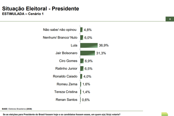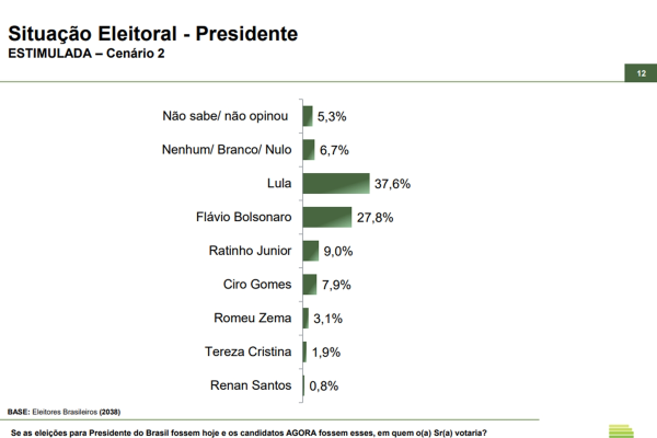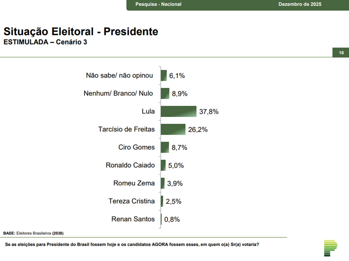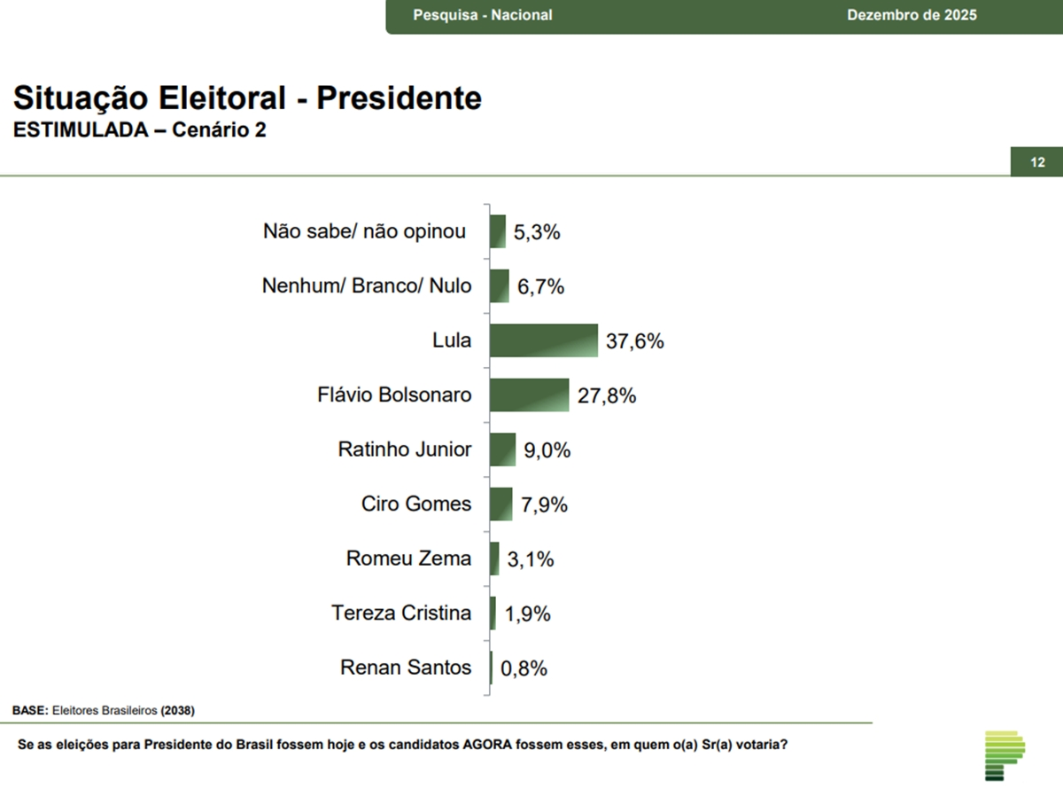 No segundo cenário de primeiro turno, Lula mantém a liderança, com 37,6%, enquanto Flávio Bolsonaro soma 27,8%. Ratinho Junior aparece com 9%, seguido por Ciro Gomes, com 7,9%, Zema, com 3,1%, Tereza Cristina, com 1,9%, e Renan Santos, com 0,8%.