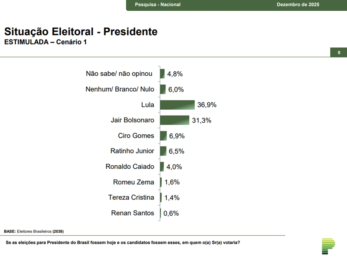 No primeiro cenário de primeiro turno, que inclui Jair Bolsonaro, inelegível e condenado a 27 anos e 3 meses por tentativa de golpe de Estado, Lula aparece com 36,9% das intenções de voto, contra 31,3% do ex-presidente. Na sequência surgem Ciro Gomes (PSDB), com 6,9%, Ratinho Junior (PSD), com 6,5%, Ronaldo Caiado (União Brasil), com 4%, Romeu Zema (Novo), com 1,6%, Tereza Cristina (PP), com 1,4%, e Renan Santos (Missão), com 0,6%.
