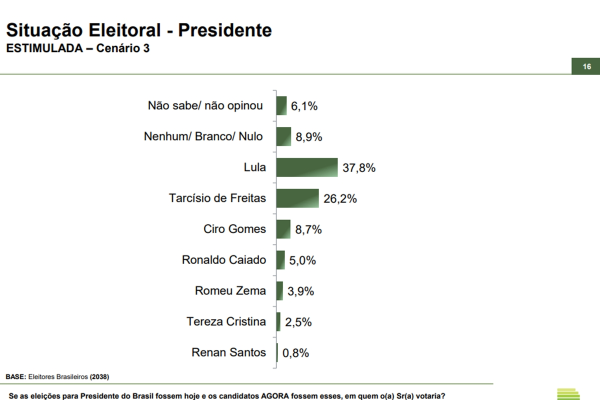A terceira simulação inclui o governador de São Paulo, Tarcísio de Freitas. Nesse caso, Lula alcança 37,8% das intenções de voto, contra 26,2% de Tarcísio. Ciro Gomes aparece em terceiro, com 8,7%, seguido por Ronaldo Caiado, com 5%, Romeu Zema, com 3,9%, Tereza Cristina, com 2,5%, e Renan Santos, com 0,8%.