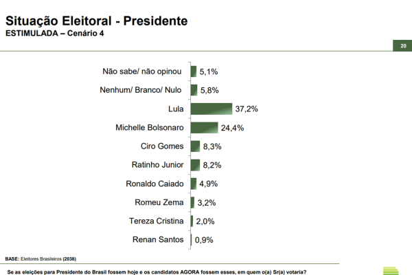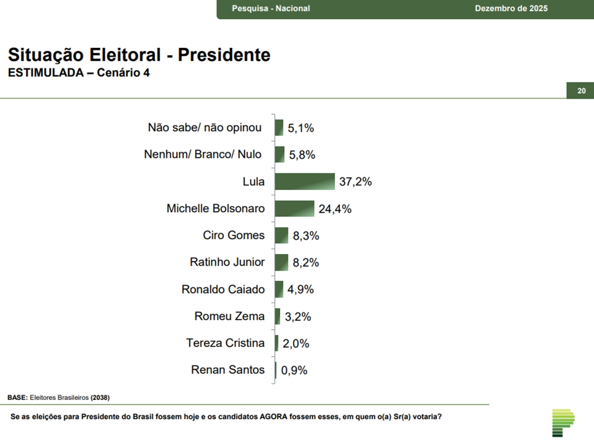 Entre os nomes testados, a ex-primeira-dama Michelle Bolsonaro é quem apresenta a maior distância em relação a Lula no primeiro turno. Ela aparece com 24,4%, contra 37,2% do presidente, uma diferença de 12,8 pontos percentuais. Na sequência vêm Ciro Gomes, com 8,3%, Ratinho Junior, com 8,2%, Ronaldo Caiado, com 4,9%, Romeu Zema, com 3,2%, Tereza Cristina, com 2%, e Renan Santos, com 0,9%.