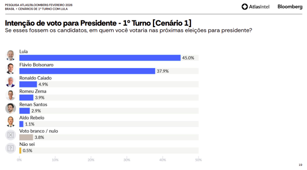 Na Atlas Intel divulgada nesta semana, Lula aparece com 45% das intenções de voto, contra 39% de Flavio Bolsonaro.