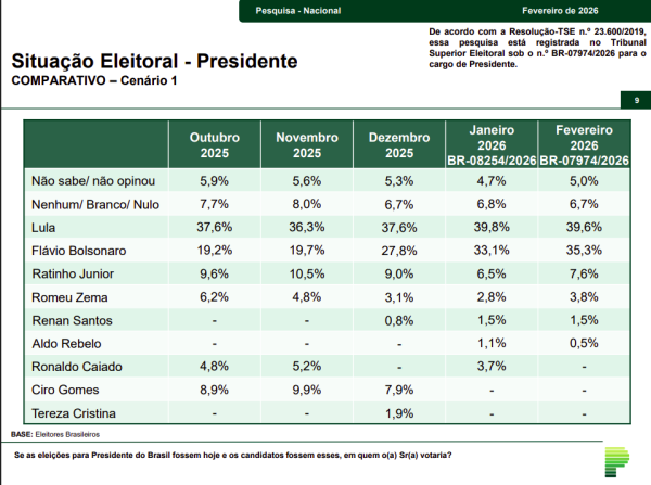 Repare que Lula vem se mantendo estável ao longo dos últimos meses, tendo inclusive crescido em relação aos 36%-37% que apresentava nos últimos meses de 2025.