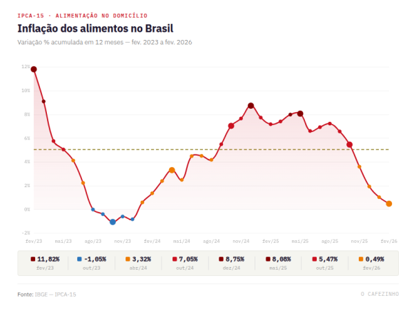 Segundo o IBGE, a inflação de alimentos no Brasil caiu para 0,49% em fevereiro, no acumulado de 12 meses, o que é um dos menores números da história do país.