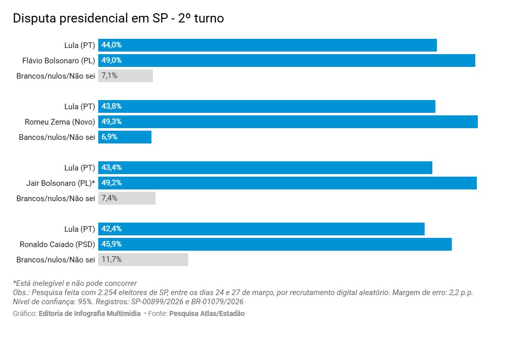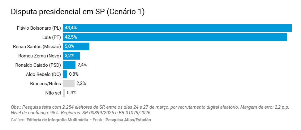 A pesquisa Atlas/Estadão foi realizada entre 24 e 27 de março, com 2.254 eleitores de São Paulo ouvidos por recrutamento digital aleatório. A margem de erro é de dois pontos percentuais, com nível de confiança de 95%. O levantamento está registrado no TSE sob o protocolo BR-01079/2026.