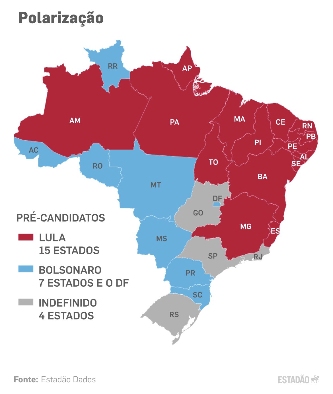 O ex-presidente Luiz Inácio Lula da Silva tem liderado em 15 das 27 unidades da Federação, segundo dados do Estadão. O presidente Jair Bolsonaro (PL) tem melhor desempenho em oito estados. O levantamento do jornal é baseado em pesquisas eleitorais e resultados de votações.