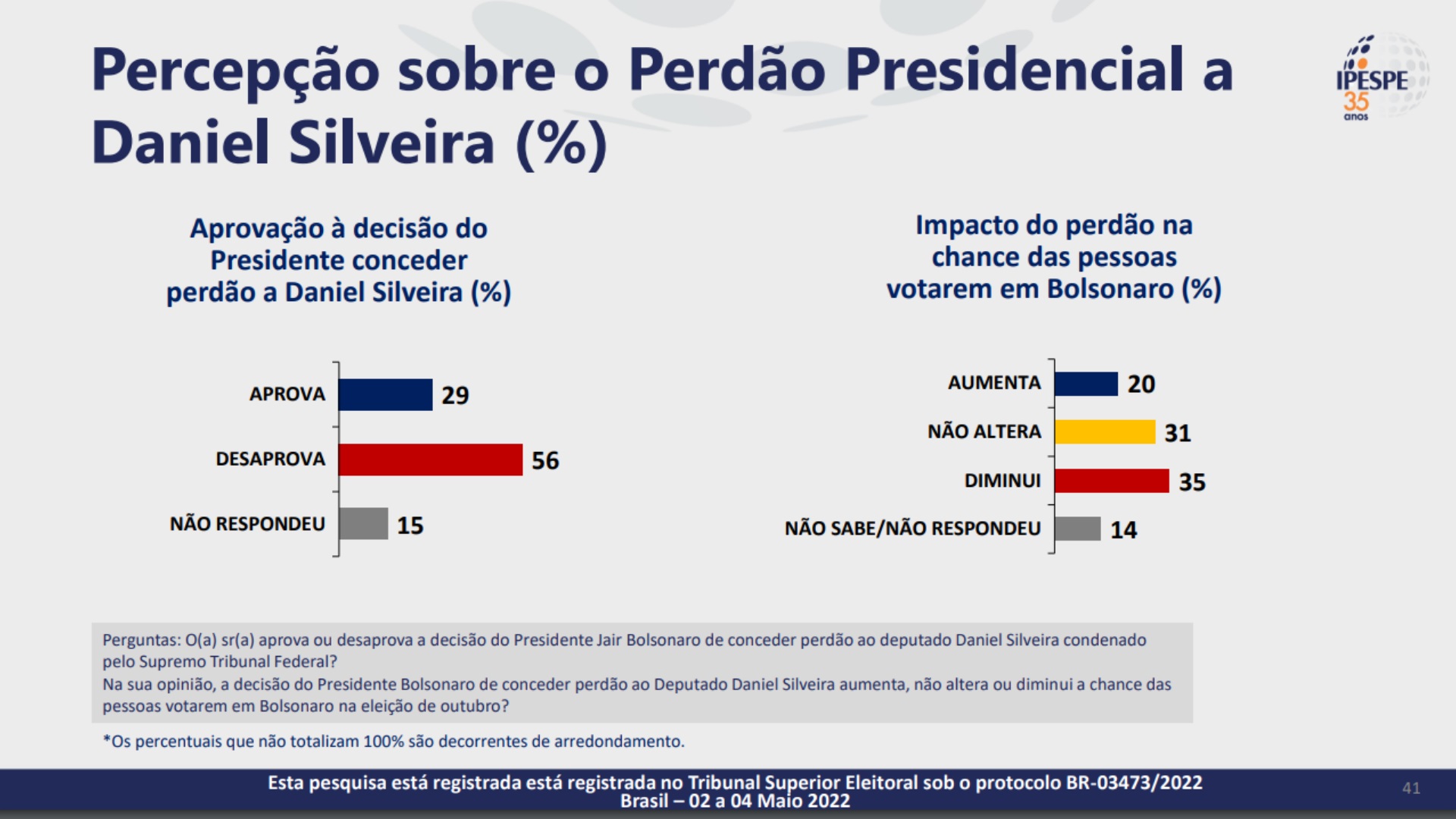 Perguntados se o perdão presidencial a Silveira tem algum impacto na chance das pessoas votarem em Bolsonaro nas eleições deste ano, 35% responderam que sim. 20% afirmaram que aumenta a chance de apoiar a reeleição e 31% acreditam que a decisão não altera sua opinião. 14% não souberam dizer.