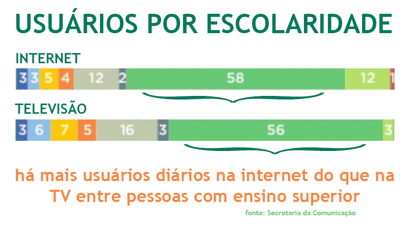 Eis um dado interessante da pesquisa nacional de mídia feita pela Secretaria da Comunicação brasileira e publicada esta semana: entre as pessoas com nível de educação superior, há mais usuários diários da internet do que da TV.