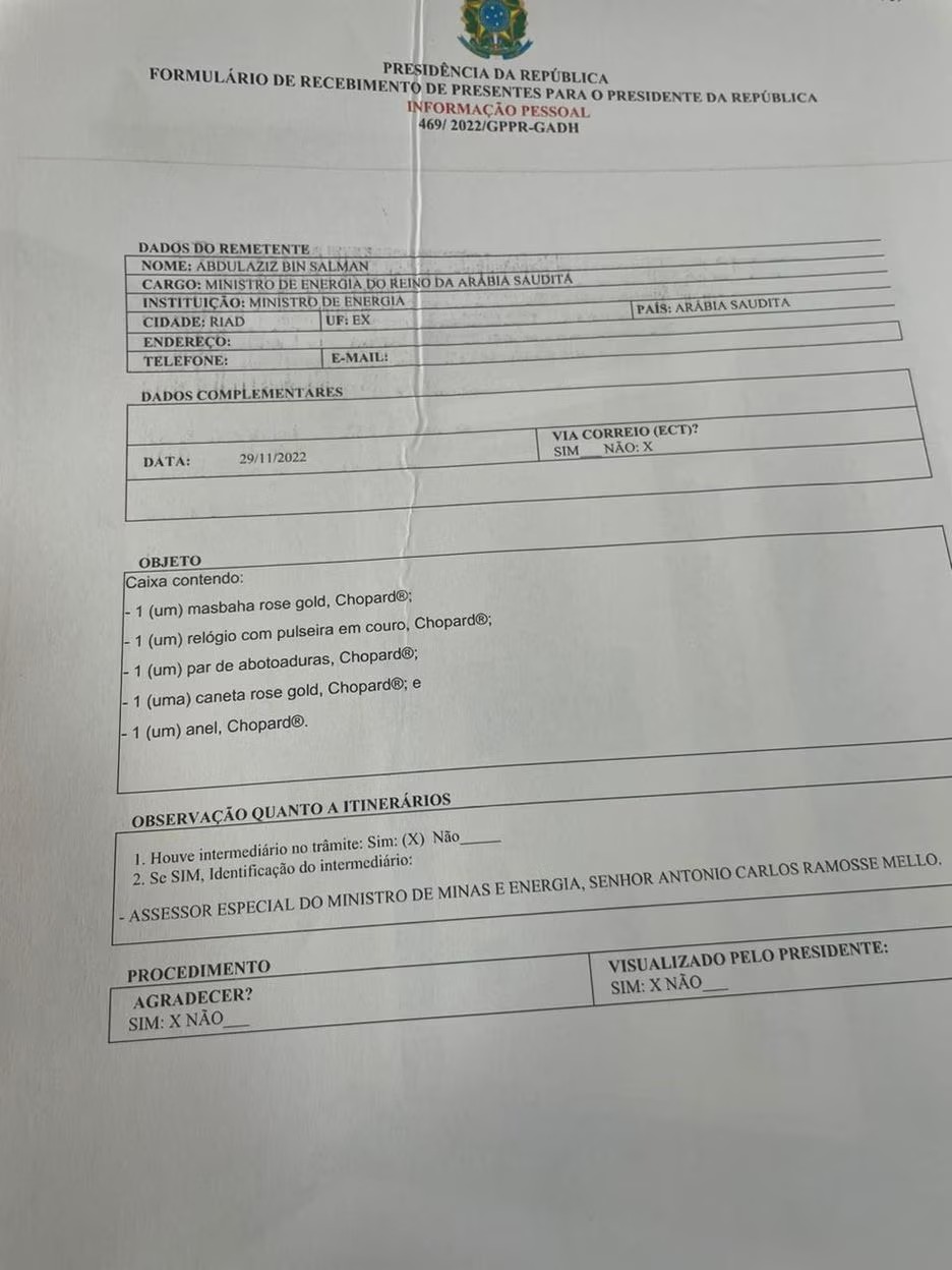 As joias foram entregues no Palácio da Alvorada, residência oficial dos presidentes da República, no dia 29 de novembro de 2022. O recibo da entrega foi assinado pelo funcionário Rodrigo Carlos dos Santos. O documento ainda traz um item questionando se o item foi visualizado por Bolsonaro. A resposta é “sim”.