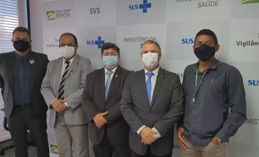 O reverendo Amilton Gomes, da Senah, no Ministério da Saúde junto a Dominguetti (o primeiro da foto à esquerda), o diretor do Departamento de Imunização e Doenças Transmissíveis, Lauricio Monteiro Cruz (meio) e major da FAB Hardaleson Araújo de Oliveira (segundo à dir.)