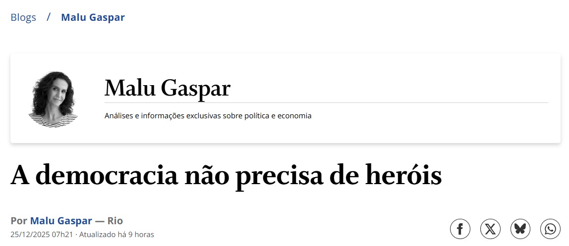 E o que temos no dia 25, de presente de Natal, é quase um editorial de Malu no seu retorno à capa do Globo. Esse é o título da coluna: “A democracia não precisa de heróis”.