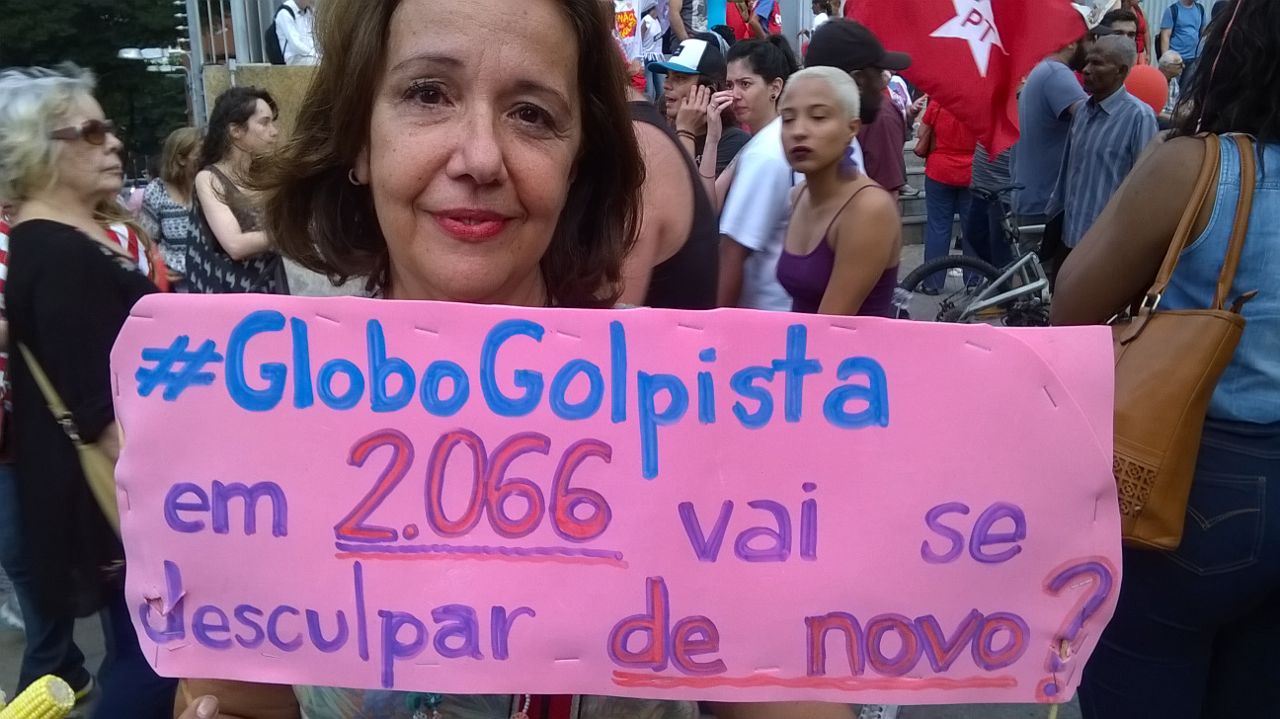 De Erika Nakamura, direto da Paulista: “Abriram o ato com uma grande vaia à Globo. Tá ficando muito cheio.”