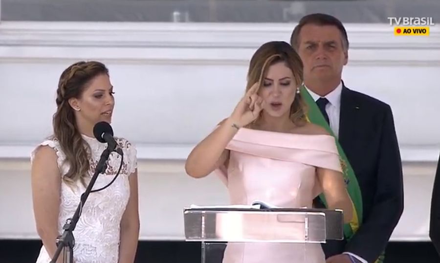 Michelle fez um discurso no parlatório do Palácio do Planalto em que se dirigiu ao público por meio de Libras, que é a sigla de Língua Brasileira de Sinais.