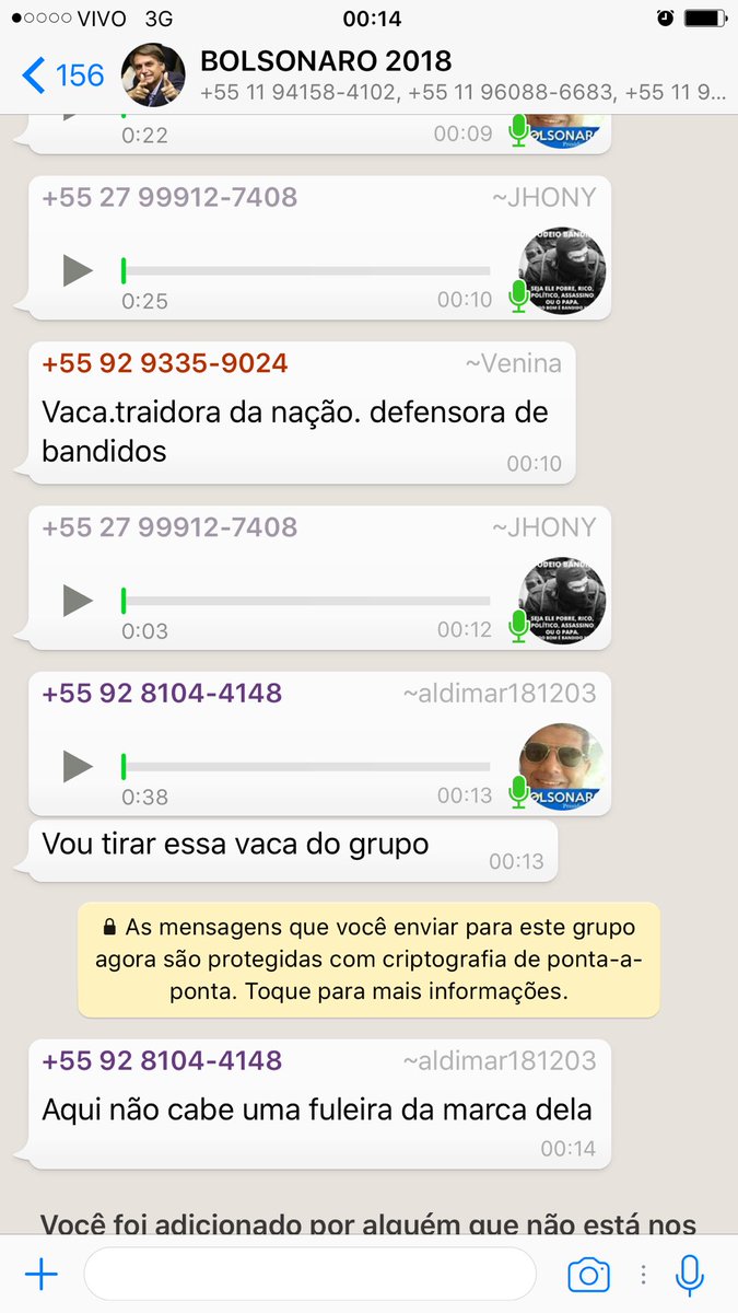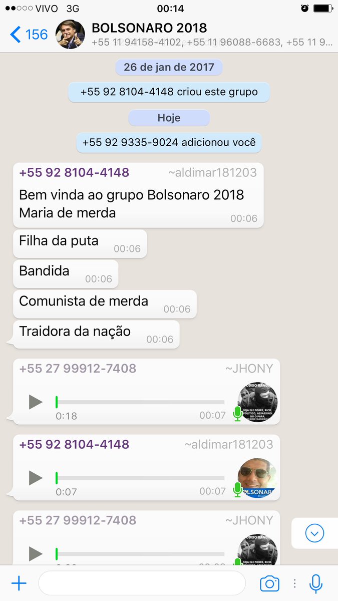 Como escrevi mais cedo, a tática ignominiosa agora é incluí-la em grupos de WhatsApp “sob medida”: policiais, detratores de direitos humanos, racistas, neonazistas, além de, obviamente, comunidades de bolsonaristas que fazem campanha para 2018.