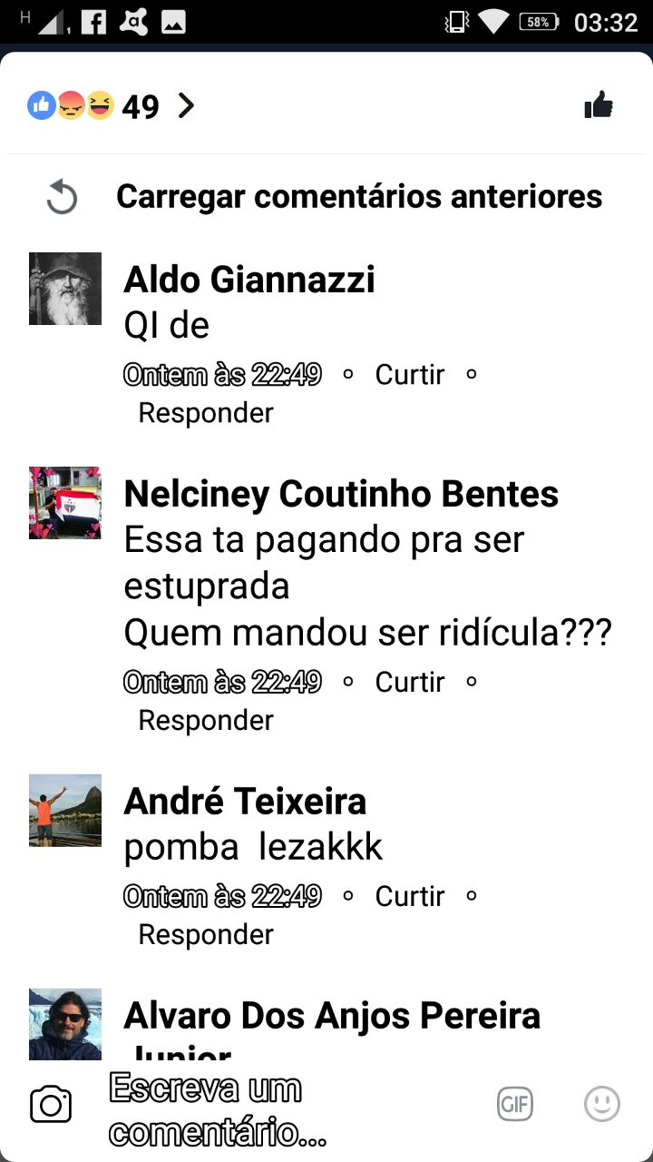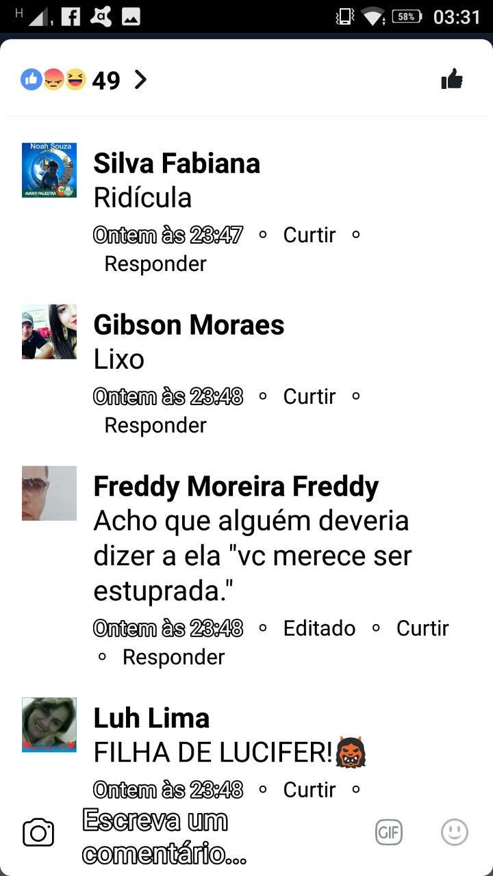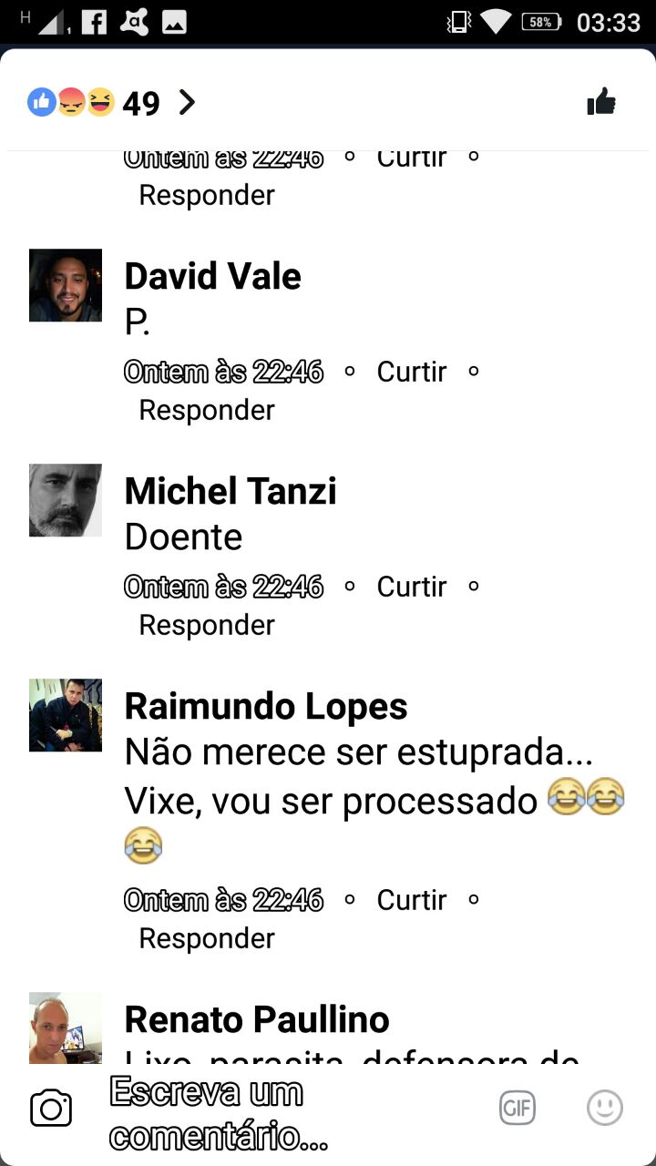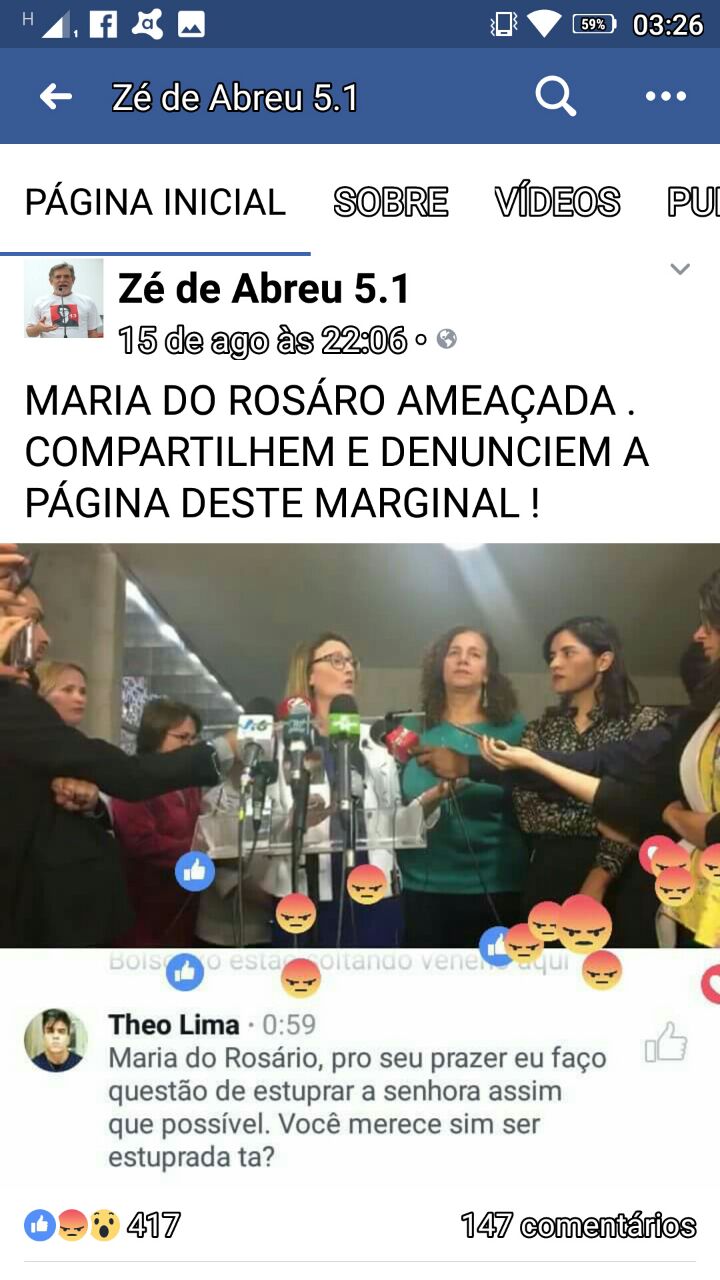 Um certo Theo Lima escreveu o seguinte: “Eu faço questão de estuprar a senhora assim que possível. Você merece sim ser estuprada, tá?”