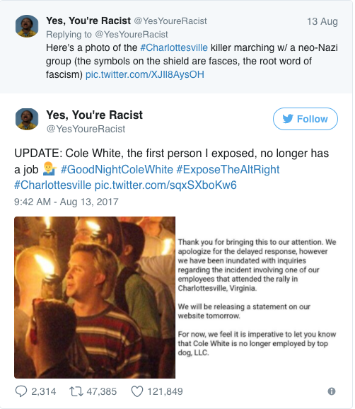 Depois da pancadaria em Charlottesville, a conta Yes, You’re Racist, do Twitter, passou a identificar os fascistas que participaram do ato.