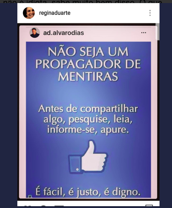 Numa demostração de cinismo, ela compartilha na sequencia um post de Álvaro Dias: “não seja um propagador de mentiras”.