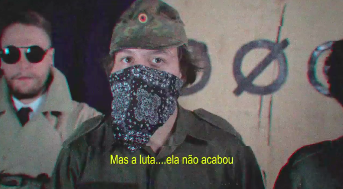 Dois sujeitos mascarados, à frente de outros dois fantasiados de sabe deus o quê, fazem uma espécie de prestação de contas (não financeiras) e conclamam seus seguidores a continuar a luta.
