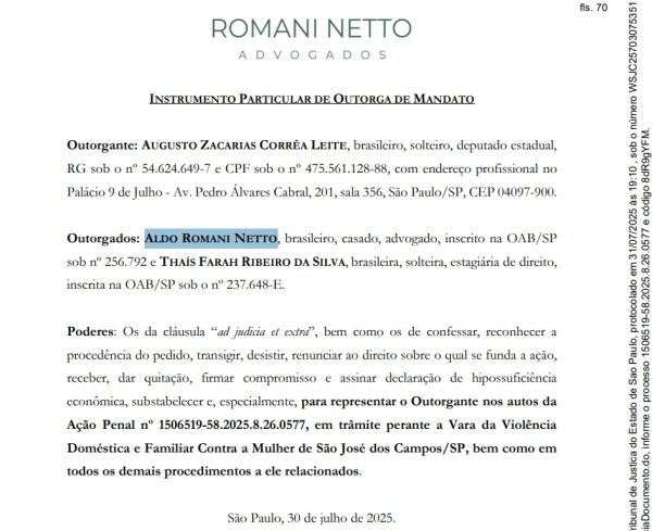 Na realidade, porém, o advogado do MBL, Aldo Romani Netto, é o defensor de Guto Zacarias no caso de coação para o aborto desde, pelo menos, 30 de julho do ano passado, tendo total conhecimento a respeito do caso desde então. É que o mostram documentos dos autos da ação penal movida contra Zacarias, como se pode ver no trecho abaixo.