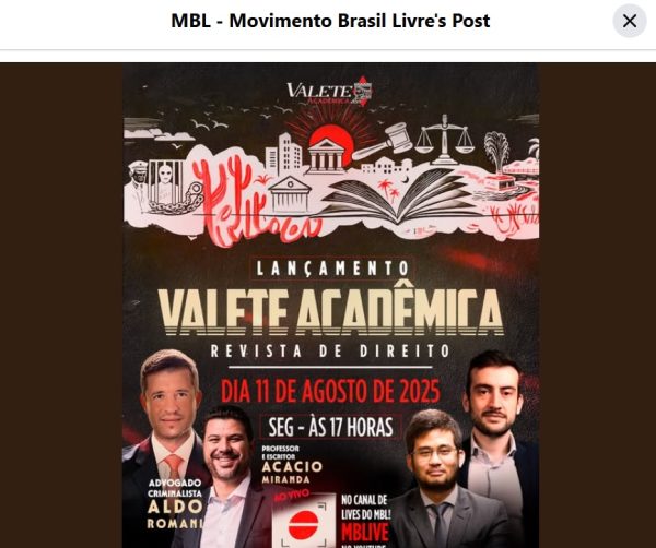 Menos de um mês após assumir a defesa de Zacarias no processo por coação, corrente na Vara da Violência Doméstica e Contra a Mulher de São José dos Campos (SP), Aldo Romani Netto participou de evento de lançamento da revista “Valete Acadêmica”, periódico de análises jurídicas publicado pelo MBL.