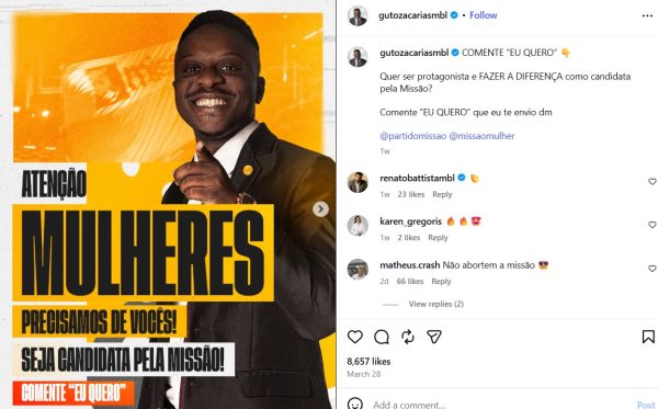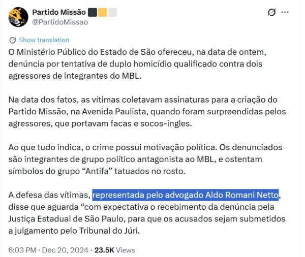 De fato, já no dia 20 de dezembro de 2024, Romani Netto atuava como advogado do Missão, conforme o próprio partido publicou em suas redes sociais.