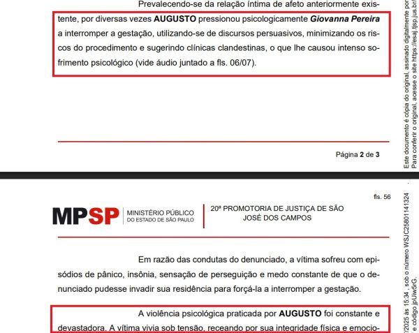 Para a promotoria paulista, “a violência psicológica praticada por AUGUSTO (Guto Zacarias) foi constante e devastadora. A vítima vivia sob tensão, receando por sua integridade física e emocional, bem como pela segurança de sua filha. O denunciado agia de modo a causar intimidação e controle, desestabilizando emocionalmente a vítima.”